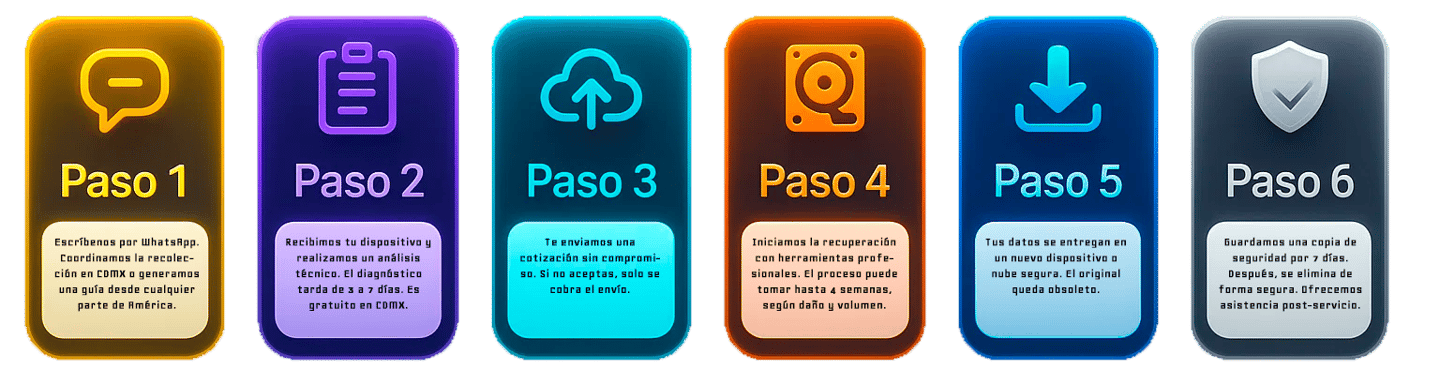 En Terafix recuperamos información valiosa desde memorias USB, micro SD, discos duros, SSDs, y equipos que ya no encienden. Atendemos casos por fallos físicos, formateos accidentales, daños por agua o calor, errores de sistema y ataques de virus o ransomware. Utilizamos técnicas avanzadas de recuperación, con diagnóstico especializado y absoluta confidencialidad. Ya sea un documento clave, fotografías importantes o proyectos enteros, en Terafix entendemos lo que significa perder datos... y tenemos las herramientas para recuperarlos. Recibimos dispositivos de todo México y América, con atención clara, humana y profesional desde el primer contacto.